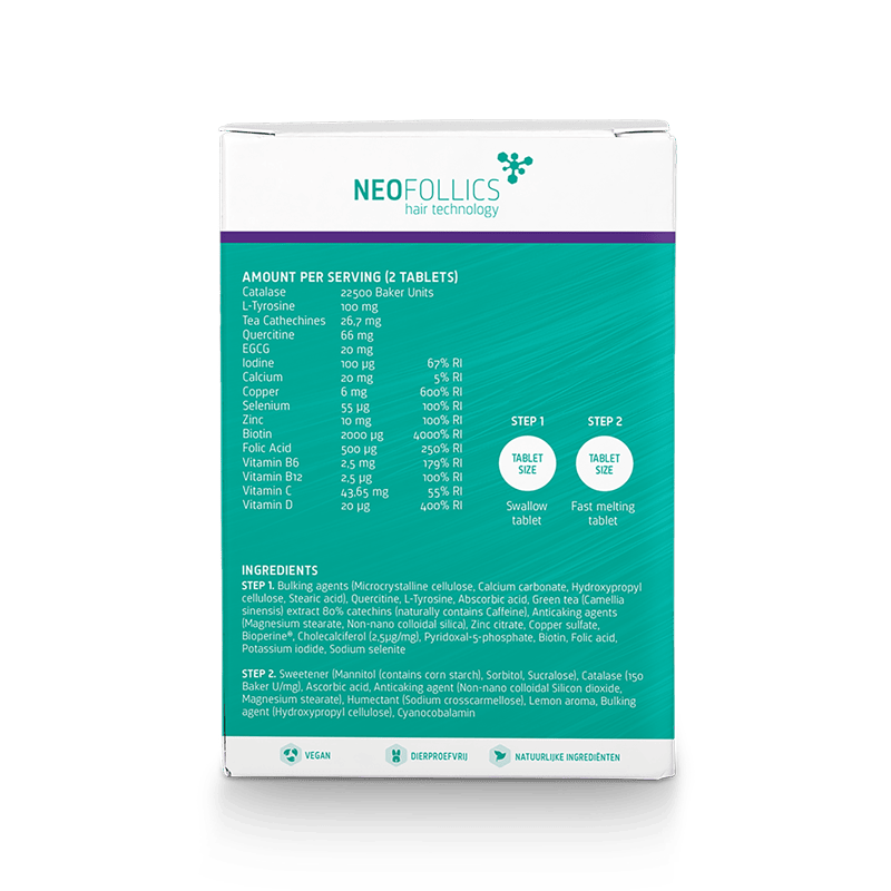 Schritt 2: Catalase Fast-Melting Tablet (STEP 2): Diese Tablette wird sublingual (unter der Zunge) eingenommen, damit sie schneller in den Blutkreislauf aufgenommen werden kann. Katalase ist ein Enzym, das Wasserstoffperoxid abbaut, eine chemische Verbindung, die sich mit der Zeit in den Haarfollikeln ansammelt und für den Bleicheffekt verantwortlich ist, der das Haar ergrauen lässt. Durch die Neutralisierung von Wasserstoffperoxid trägt Catalase dazu bei, dass das Haar seine Farbe nicht verliert.