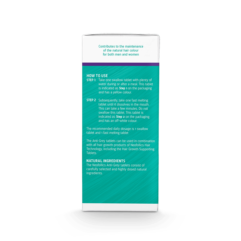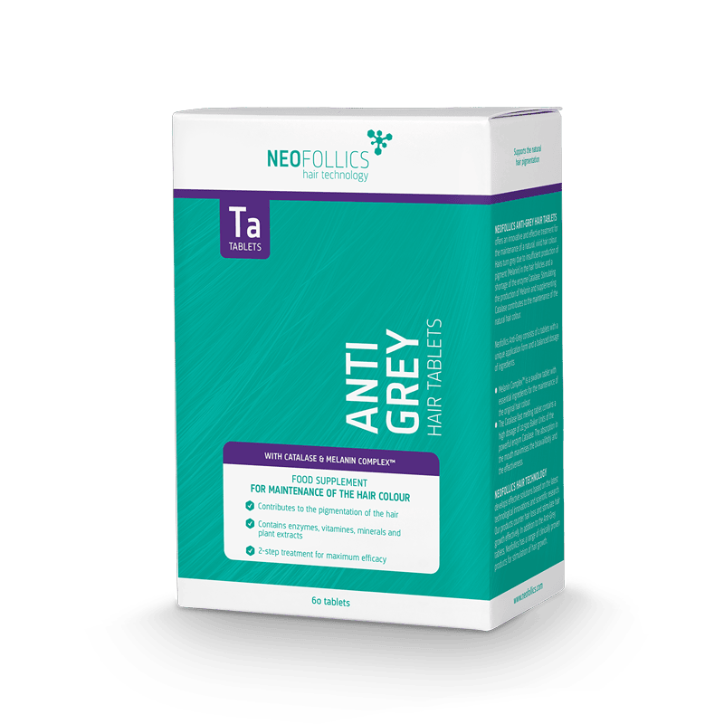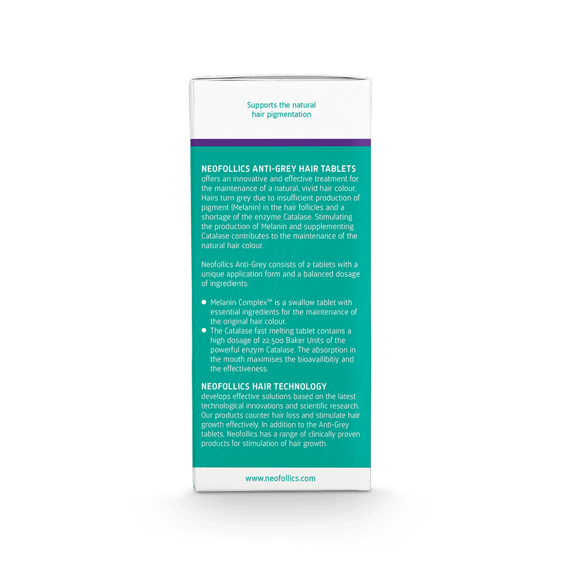 Die Neofollics Anti Grey Hair Tablets sind ein zuverlässiges Nahrungsergänzungsmittel. Sie wurden entwickelt, um das Ergrauen der Haare wirksam zu bekämpfen und die natürliche Haarfarbe zu erhalten. Die Tabletten enthalten eine einzigartige Behandlung in zwei Schritten. Schritt 1 mit Melaninkomplex-Tabletten und Schritt 2 mit Katalase. Die Tabletten enthalten außerdem wichtige Nährstoffe wie Kupfer, Zink und Biotin, welche das gesunde Haarwachstum stimulieren. Die Tabletten sind für alle Männer und Frauen geeignet, die sich im Anfangsstadium vorzeitig ergrauenden Haars befinden. In 90-180 Tagen verbessern die Tabletten die Gesamtpigmentierung und das Erscheinungsbild der natürlichen Haarfarbe. Eine Packung mit 60 Anti Grey Tablets reicht für bis zu 30 Tage.