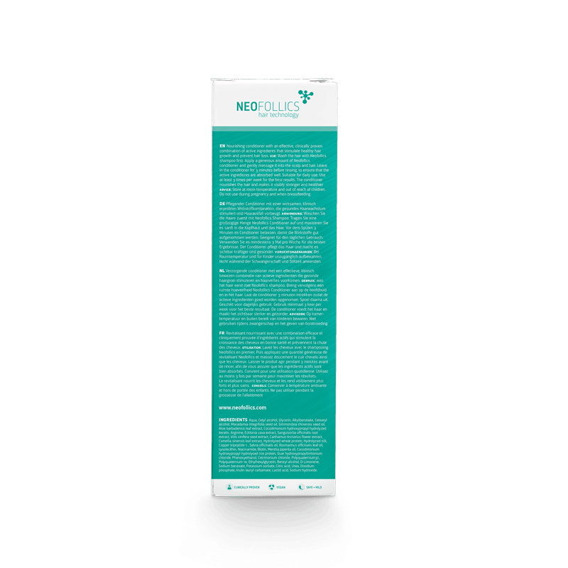Der Neofollics Hair Growth Conditioner fördert ein gesundes Haarwachstum. Er enthält 10 haarwuchsfördernde Wirkstoffe, die die Wachstumsphase des Haares verlängern. Der Conditioner nährt das Haar und die Kopfhaut, wodurch das Haar gesünder, stärker und glänzender wird. Er ist ideal für Männer und Frauen, die die Gesundheit ihrer Kopfhaut und Haare verbessern möchten. Innerhalb von 90 - 180 Tagen verbessert der Conditioner sichtbar die Haarqualität und -stärke. Eine Flasche reicht für 3 Monate.
